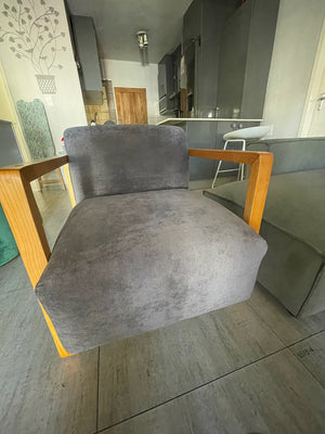 The client wanted something bold, so we went with rustic-grey fabric and square arms. Framed in oak and padded for comfort, this one’s built to last.