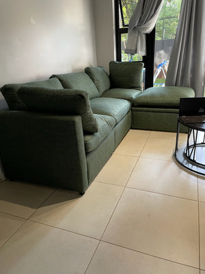 This deep green L-shaped couch was built using solid pine for the frame and layered with high-density foam for maximum comfort. It was made to tie in with warm wood tones in an open-plan lounge.