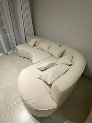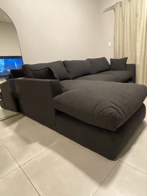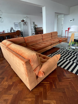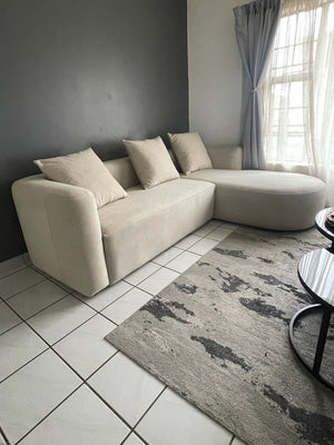 The U-shaped couch was built for lounging with extra depth and comfort in mind. Upholstered in Emperor Velvet, it opens up the space beautifully.