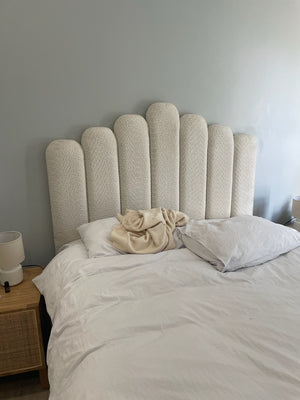 The bed design was created after the client shared a vision of a cozy, grounded space. We used a tall, panelled headboard and a neutral palette to bring that to life.